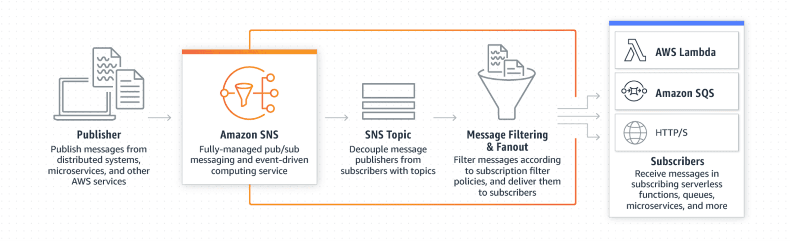 - Publish – will actually publish your message; it requires a message and a topic (which is returned from ListTopics) to work.